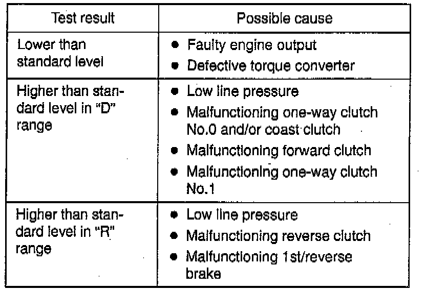 This test is to check overall performance of automatic transmission and engine by measuring stall speed at "D" and "R" ranges. Be sure to perform this test only when transmission fluid is at normal operating temperature and its level is between FULL and LOW marks.