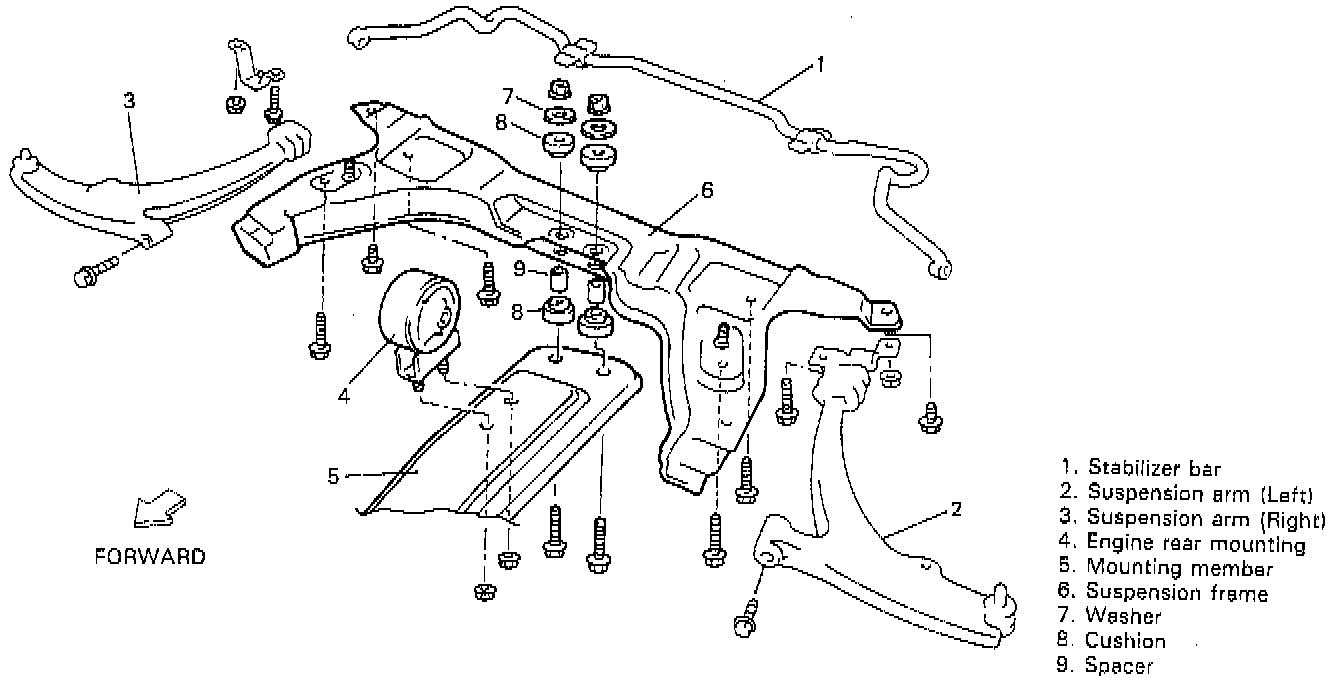 2. Install mounting member, spacers and cushions to suspension frame and tighten bolts and nuts to specified torque.