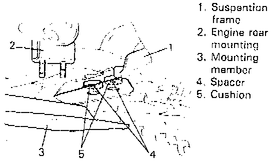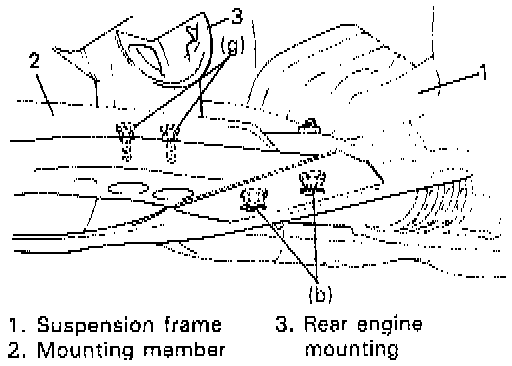 4. Remove engine rear mounting nuts and engine mounting member bolts to separate member from suspension frame.