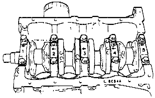 9. Loosen crankshaft bearing cap bolts in such order as indicated in image a little at a time and remove bearing caps.