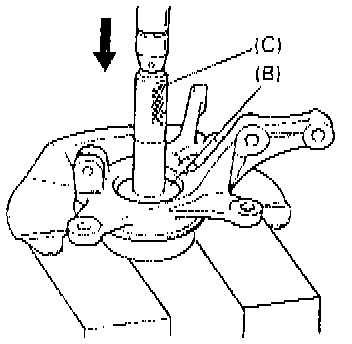 2. After removing inside oil seal, remove bearing outer race/inner bearing using special tools (B) and (C), and hydraulic press.