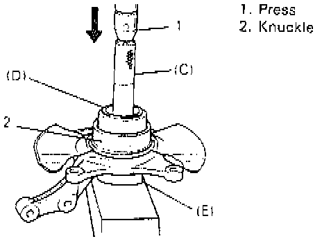 1. Press-fit bearing outer race/inner bearing using special tools (C), (D) and (E).