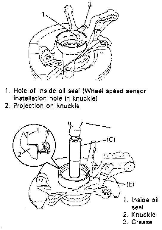 With hole in inside oil seal matched with projection on knuckle (for vehicle without ABS) or wheel speed sensor installation hole in knuckle (for vehicle with ABS), drive in Oil seal until its stepped surface contacts knuckle by using special tools (C) and (E).