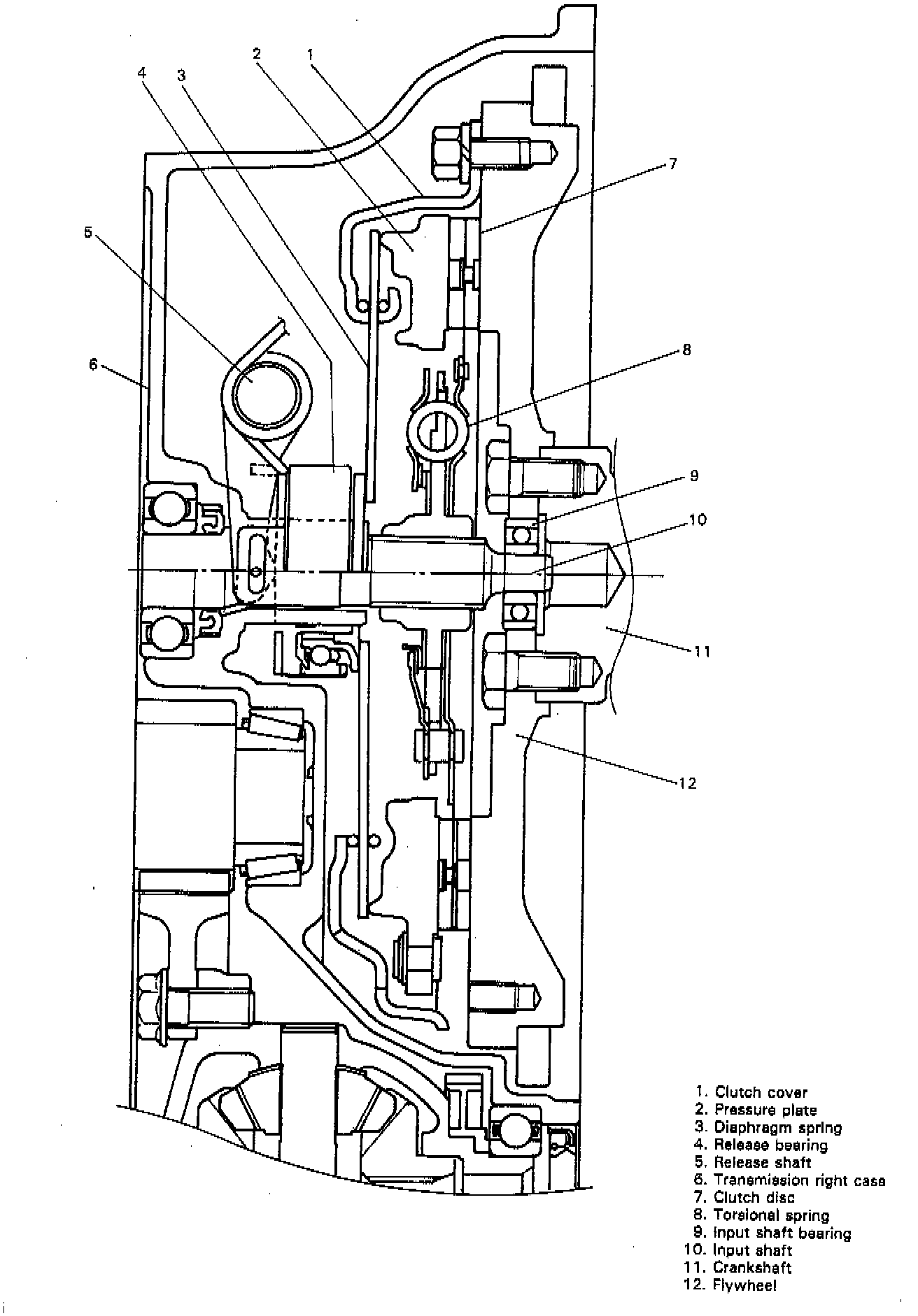 The clutch is a diaphragm-spring clutch of a dry single disc type. The diaphragm spring is of a tapering finger type, which is a solid ring in the outer diameter part, with a series of tapered fingers pointing inward.