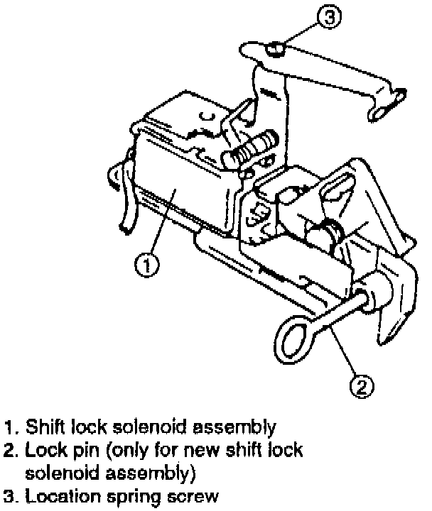 After installing the new shift lock solenoid assembly, be sure to remove the lock pin.