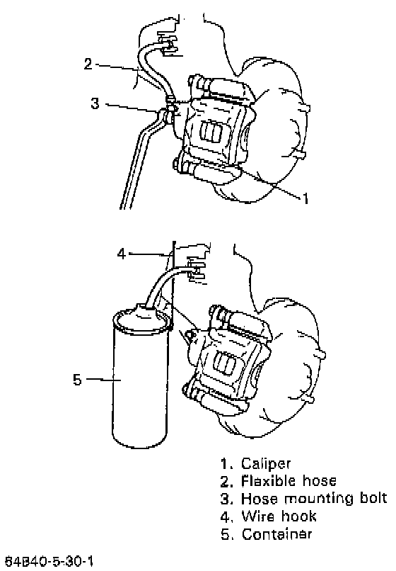 2. Remove brake flexible hose mounting bolt from caliper. This will allow fluid to flow out of hose, have a container ready beforehand.