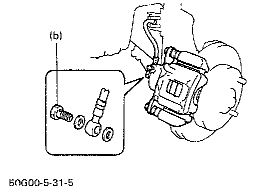 3. Install brake flexible hose as shown and torque hose mounting bolt (b): 20 - 25 Nm (14.5 - 18.0 ft. lbs.).