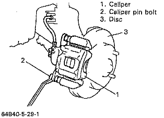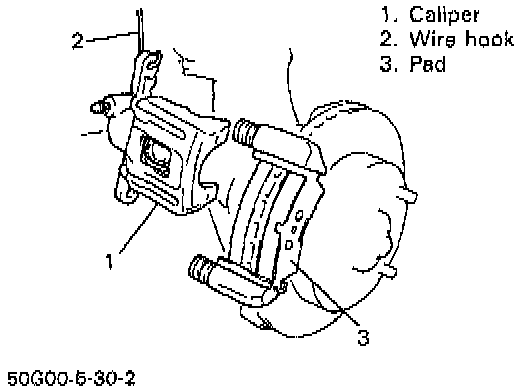 ^ Hang removed caliper with a wire hook or the like so as to prevent brake hose from bending and twisting excessively or being pulled.