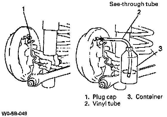 b. Remove bleeder plug cap. Attach a vinyl tube to bleeder plug, and insert the other end into container.