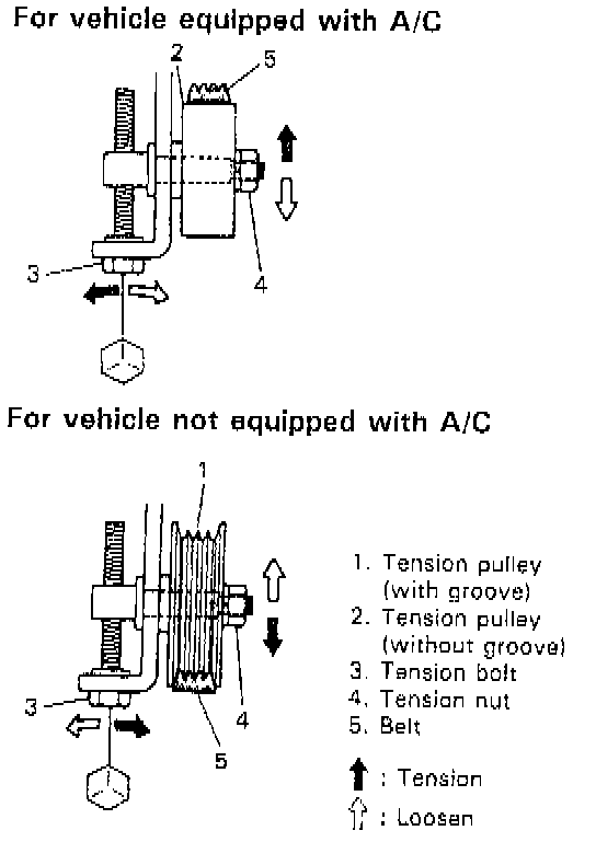 2. Adjust belt tension. With A/C equipped vehicles, turning tension bolt counterclockwise causes pulley to rise, increasing belt tension. With A/C non-equipped vehicles, turning tension bolt clockwise causes pulley to lower, increasing belt tension. In both cases, turning tension bolt in the other way decreases belt tension.