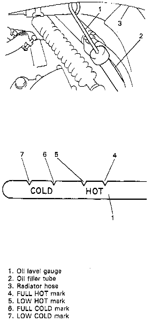 7. Take up the gauge and check oil level on it. The level should be between FULL HOT and LOW HOT marks. If level is below LOW HOT mark, add fluid to bring level to FULL HOT mark.