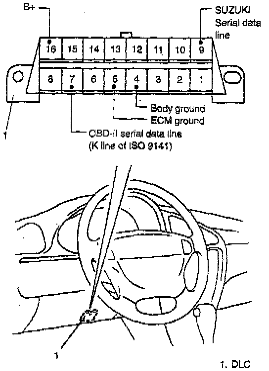OBD-II serial data line (K line of ISO 9141) is used for SUZUKI scan tool (Tech-1) or OBD-II generic scan tool to communicate with ECM. SUZUKI serial data line is used for SUZUKI scan tool (Tech-1) to communicate with an electronic control unit other than ECM (Airbag SDM, ABS control module, etc.).