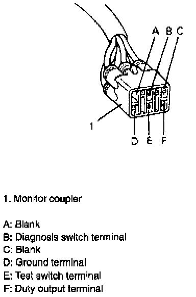 The test switch terminal is included in the monitor coupler. When this terminal is grounded, ECM fixes the ignition timing to initial one. When both test switch terminal and diagnosis switch terminal are grounded, ECM outputs A/F duty through the duty output terminal.