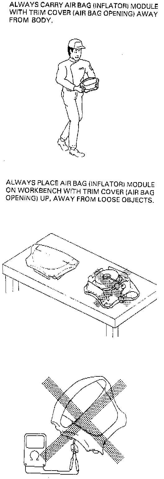 ^ When carrying a live air bag (inflator) module, make sure the bag opening is pointed away from you. In case of an accidental deployment, the bag will then deploy with minimal chance of injury. Never carry the air bag (inflator) module by the wires or connector on the underside of the module. When placing a live air bag (inflator) module on a bench or other surface, always face the bag up, away from the surface. This is necessary so that a free space is provided to allow the air bag to expand in the unlikely event of accidental deployment. Otherwise, personal injury may result.