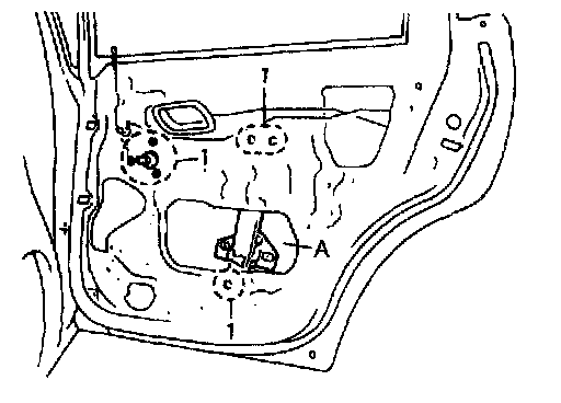 2. Remove door window regulator attaching screws (1) (six pcs.). Then, take out regulator through hole (A).