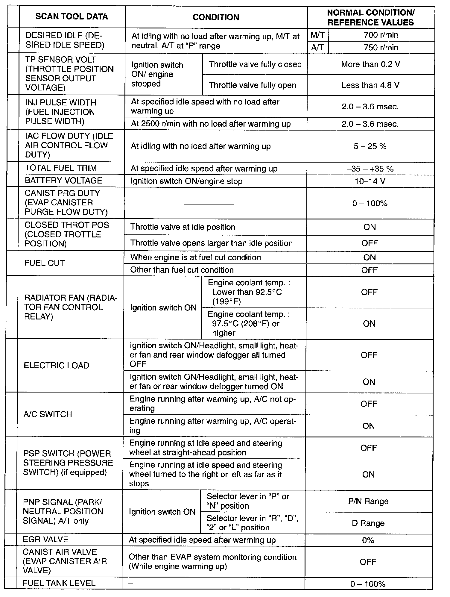 Also, conditions in the below table that can be checked by the scan tool are those detected by ECM and output from ECM as commands and there may be cases where the engine or actuator is not operating (in the condition) as indicated by the scan tool. Be sure to use the timing light to check the ignition timing.