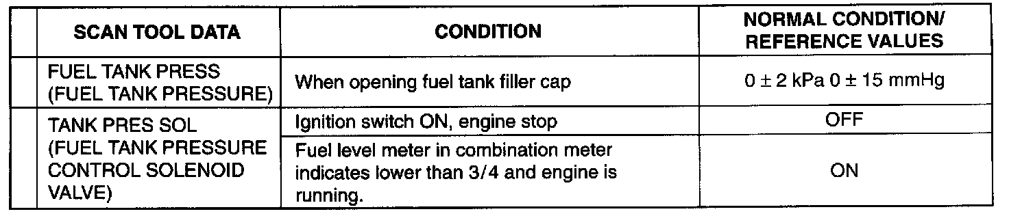 As the data values given below are standard values estimated on the basis of values obtained from the normally operating vehicles by using a scan tool use them as reference values. Even when the vehicle is in good condition, there may be cases where the checked value does not tall within each specified data range. Therefore, judgment as abnormal should not be made by checking with these data alone.