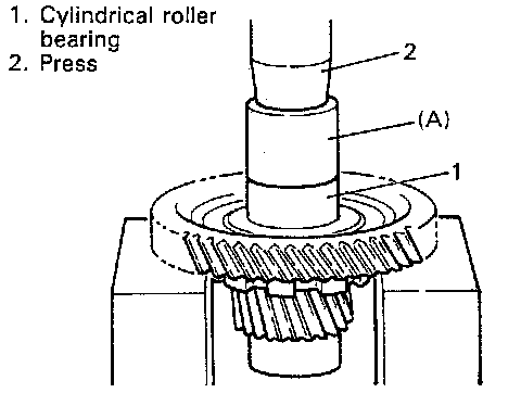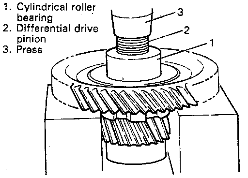 5. Remove cylindrical roller bearing by pressing differential drive pinion, using hydraulic press.