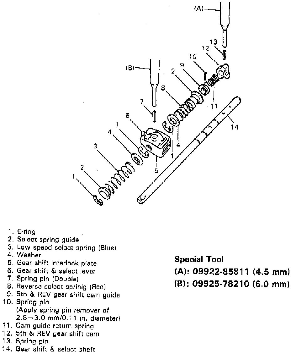 1. To disassemble component parts, use Special Tools (A): 09922-85811 (4.5 mm) and (B): 09925-78210 (6.0 mm) and 2.8 - 3.0 mm (0.11 inch) pin remover in addition.