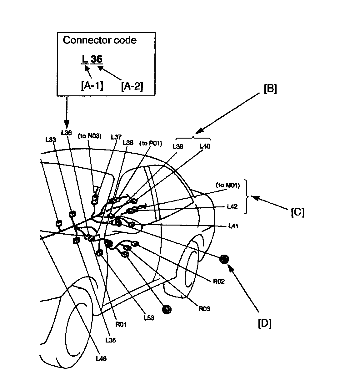 Nos. are given to male and female connectors respectively. When the harness symbol (alphabet) is different, so is the harness name. (For the details, refer to [A-1] above.)