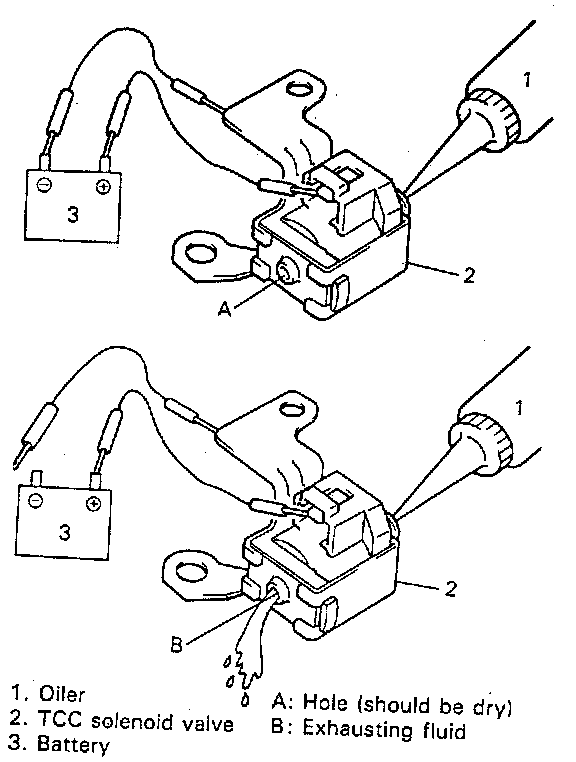 1. Apply oiler to solenoid valve and give compression by hands and then check to be sure that transmission fluid. from oiler does not come out of holes in solenoid valve when battery voltage is not conducted.