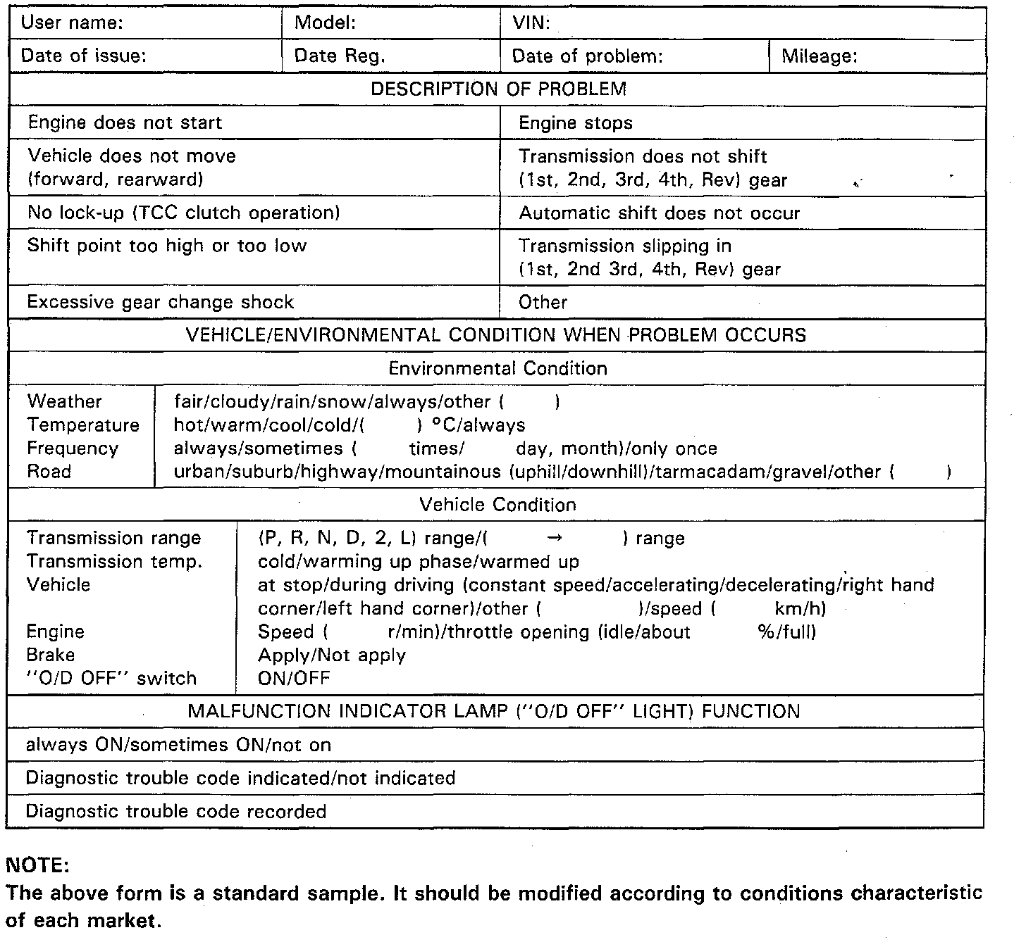 Record details of the problem (failure, complaint) and how it occurred as described by the customer. For this purpose, use of such a questionnaire form as shown will facilitate collecting information to the point required for proper analysis and diagnosis.