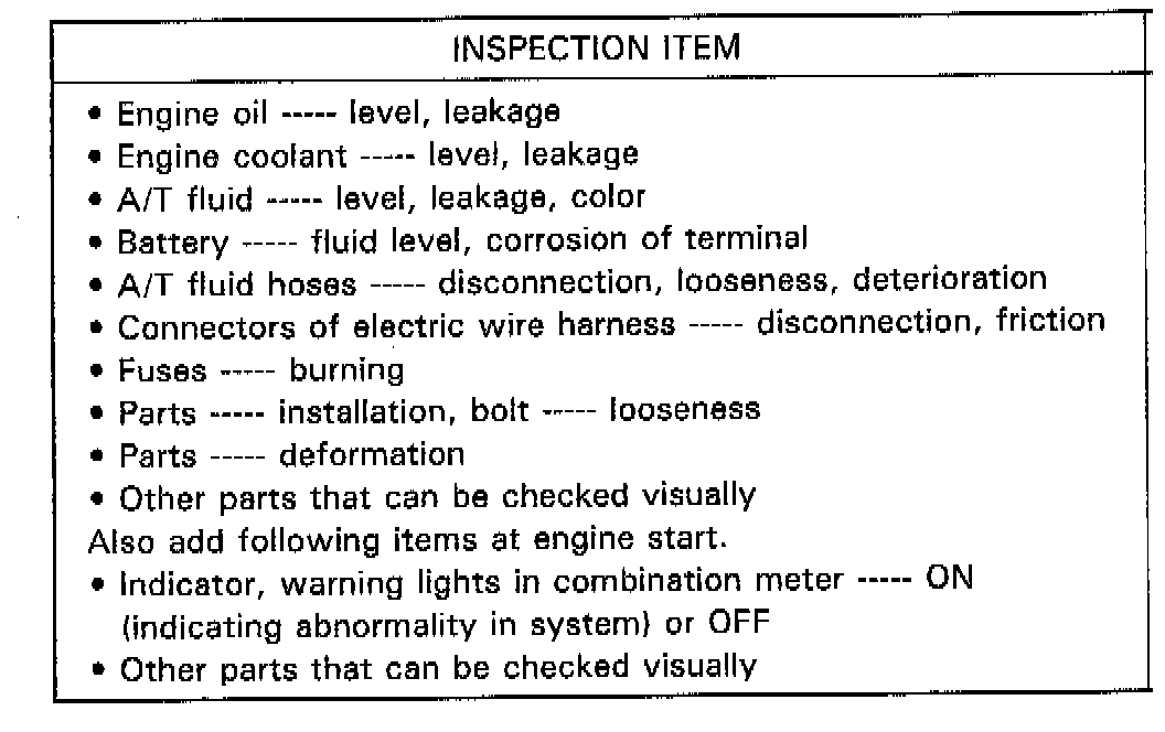 As a preliminary step, perform visual check of the following items that support proper function of the automatic transmission.