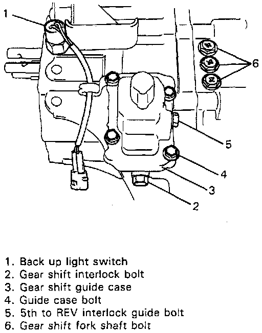 4. Remove 4 bolts from gear shift guide case, and then remove wiring harness clamp bracket and guide case.