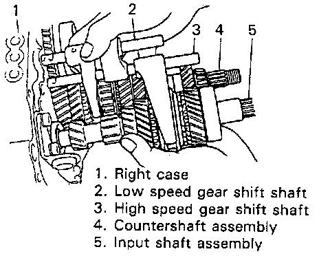 14. Tapping input shaft end with plastic hammer, push it out as assembly from case a little, then take out input shaft assembly, counter shaft assembly, high speed gear shift shaft and low speed gear shift shaft all at once.