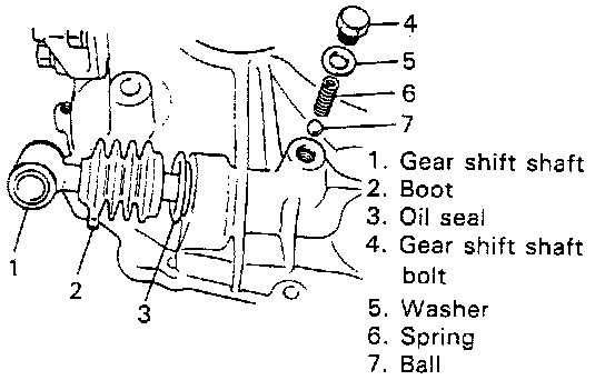 6. Remove gear shift shaft bolt with washer, then take out spring and steel ball.
