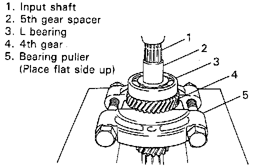 2. Drive out 5th gear spacer, L bearing and 4th gear all at once by using puller and press.