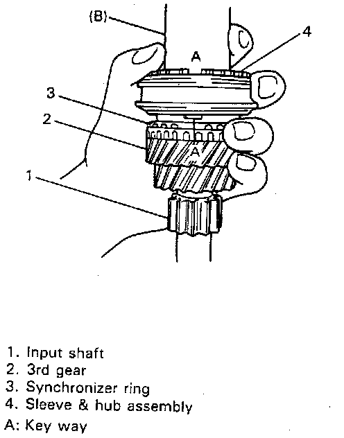 ^ While press-fitting sleeve & hub, make sure that synchronizer ring key slots are aligned with keys in sleeve & hub assembly.