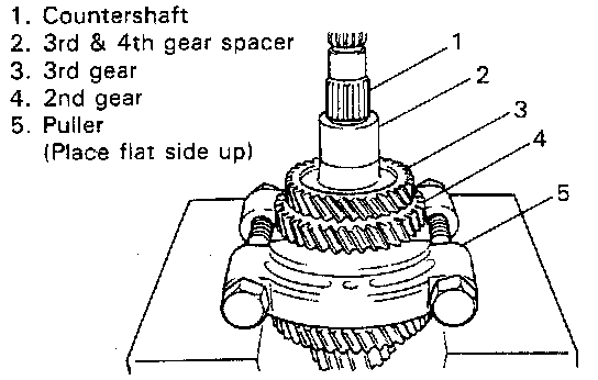 2. Apply puller to 2nd gear and drive out 3rd & 4th gear spacer together with 2nd gear by using press. Needle bearing would come out with 2nd gear.