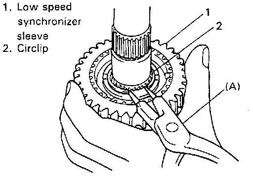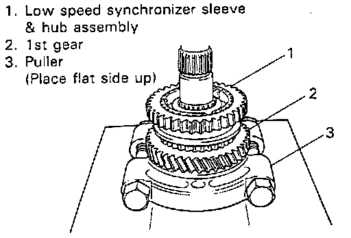 5. Apply puller to 1st gear and drive out low speed synchronizer sleeve & hub assembly with gear by using press.