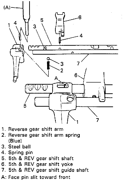 ^ Drive in spring pin for reverse shift arm facing slit A toward front.