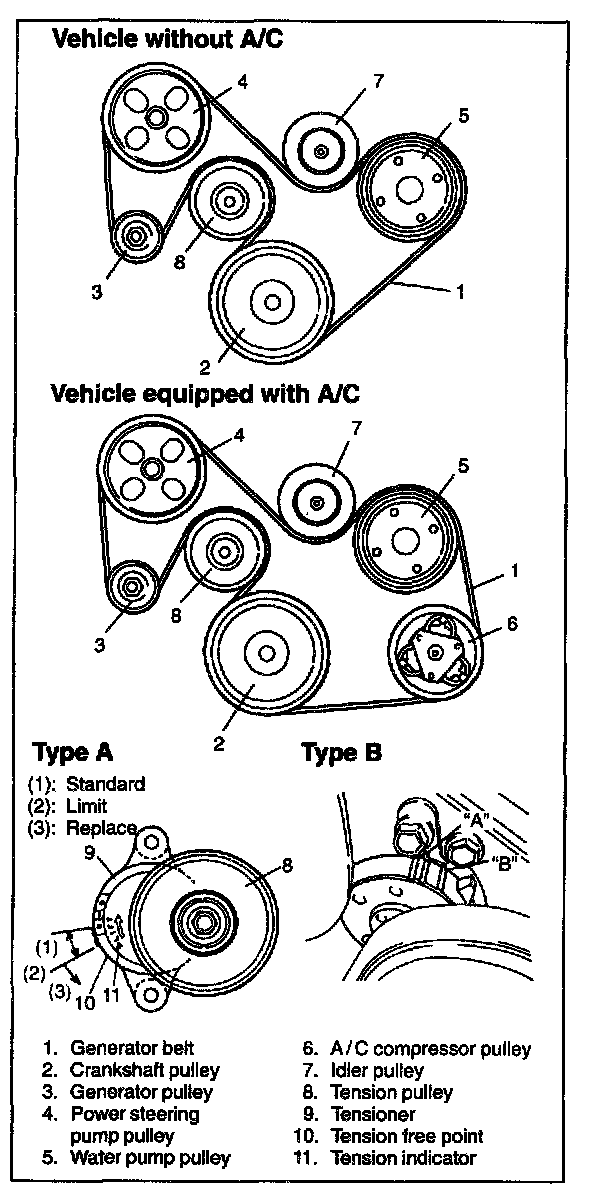 Tension indicator "B" should be the right of indicator "A" as shown in figure. If indicator "B" is found to the left of indicator "A", replace generator belt.
