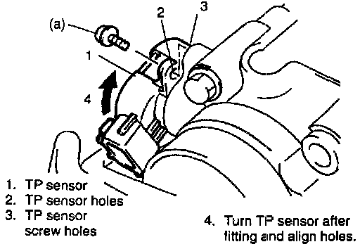 Fit TP sensor to throttle body in such way that its holes are a little away from TP sensor screw holes as shown in left figure and turn TP sensor clockwise so that those holes align.