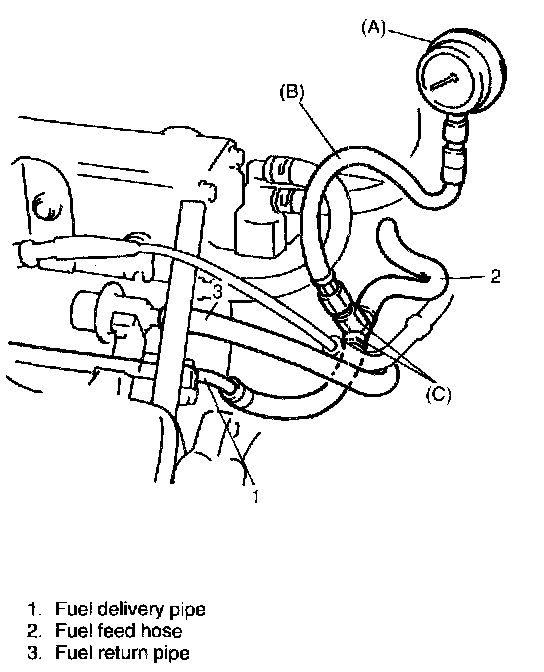 3) Connect special tools and hose between fuel delivery pipe and fuel feed hose as shown in figure, and clamp hoses securely to ensure no leaks occur during checking.