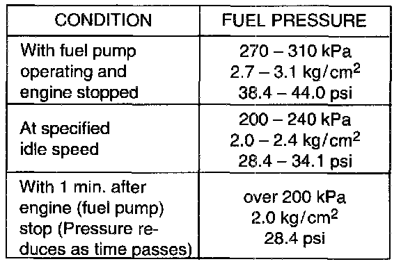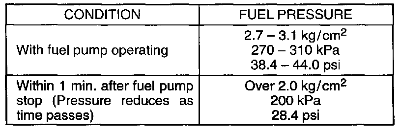 If measured pressure doesn't satisfy specification, refer to "Diagnostic Flow Table B-3" B-3 Fuel Pressure and check each possibly defective part. Replace if found defective.