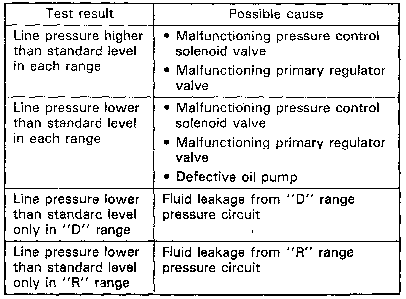 LINE PRESSURE TESTPurpose of this test is to check operating conditions of each part by measuring fluid pressure in fluid pressure line. Line pressure test requires following conditions.