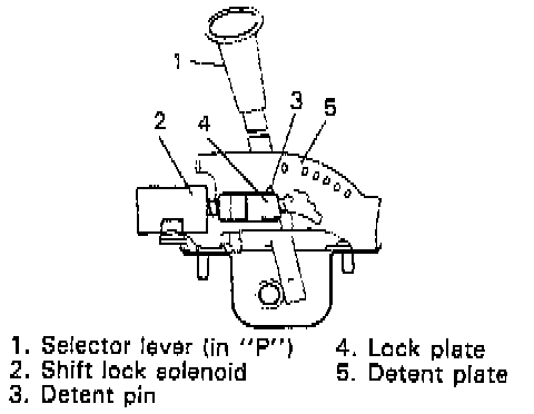 When the select lever is in "P" range, the ignition key position is "ON" and depressing the brake pedal cause the electric current to flow to the solenoid. As the lock plate is drawn toward the solenoid in this state, it frees the detent pin, which then allows the select lever to be shifted from "P" range to any other position.