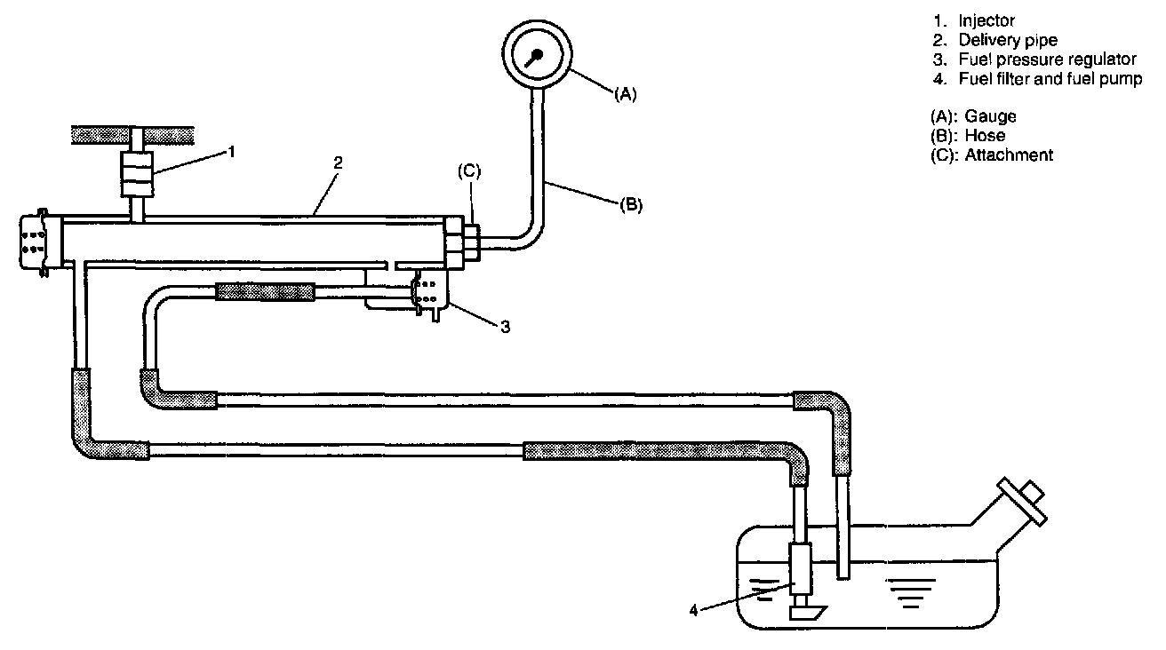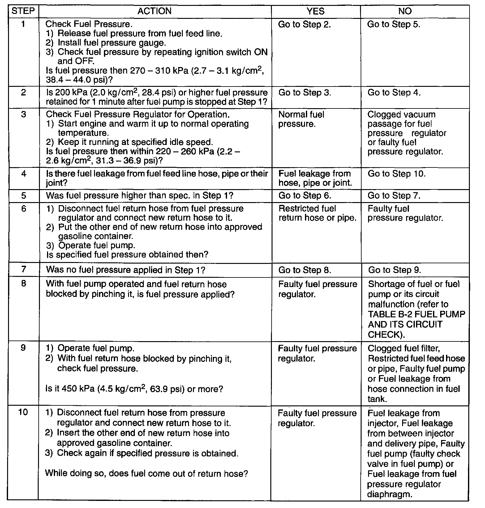 NOTE: Before using the following table, check to make sure that battery voltage is higher than 11 V. If battery voltage is low, pressure becomes lower than specification even if fuel pump and line are in good condition.