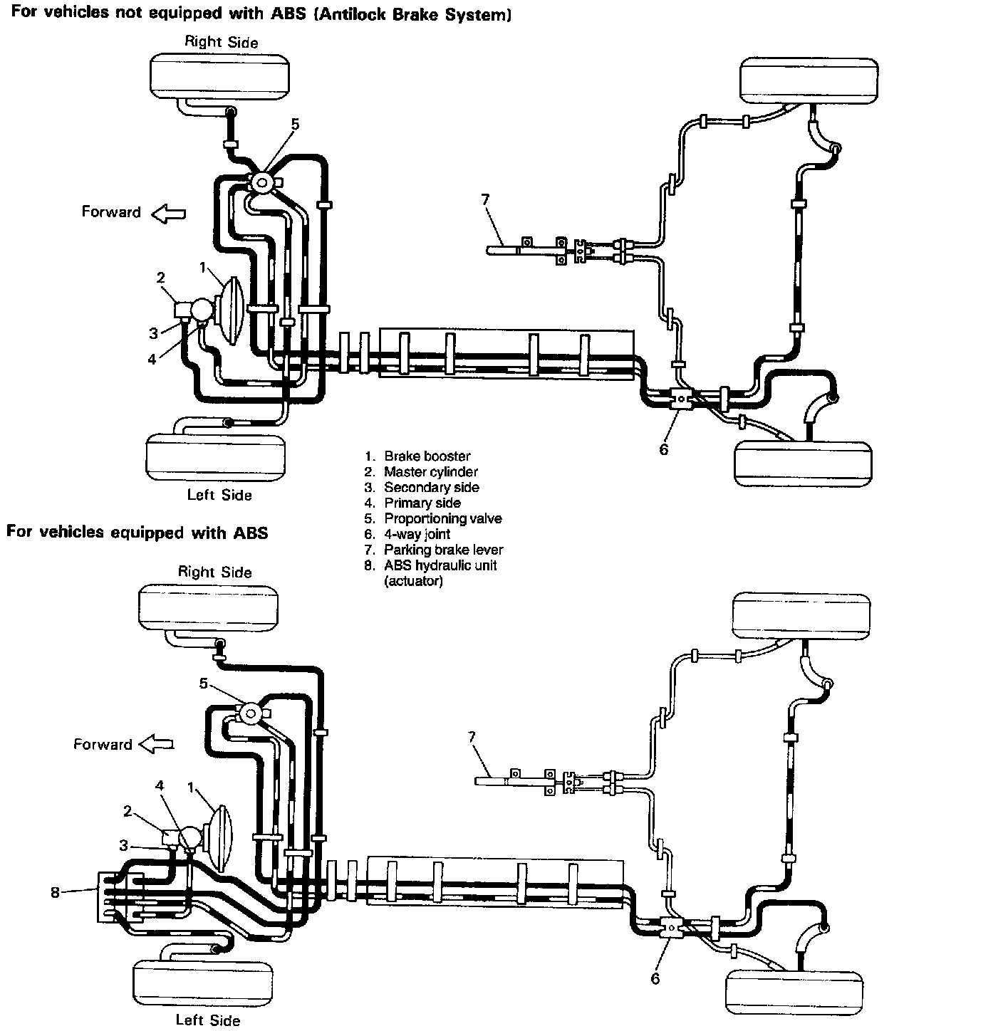 The proportioning valve (P valve) is included in these circuits between the master cylinder and rear wheels. In brake system of this model, the disc brake type is used for the front wheel brake and a drum brake type (leading /trailing shoes) for the rear wheel brake.