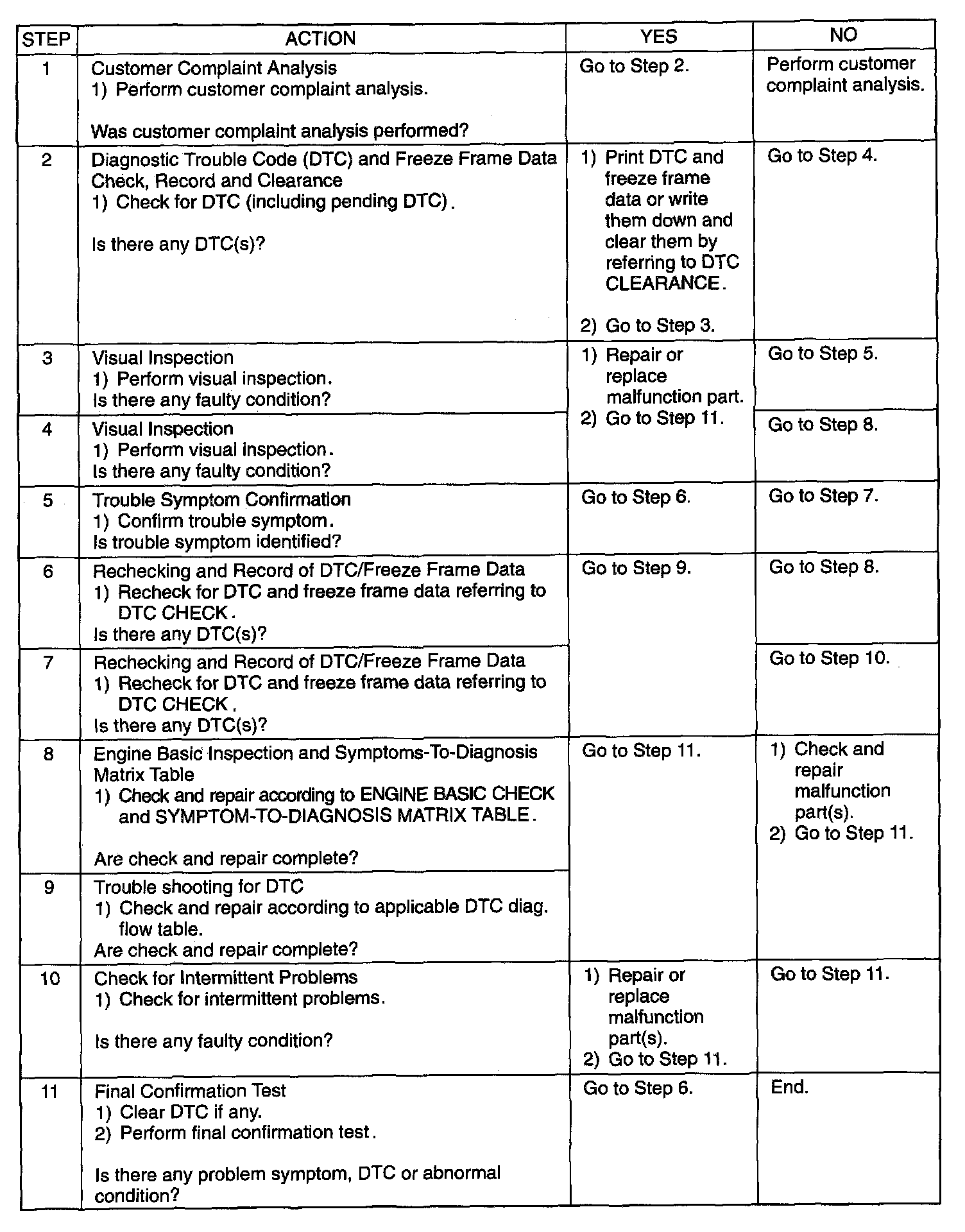 Perform basic engine check according to the "Engine Basic Inspection Flow Table" first. When the end of the flow table has been reached, check the parts of the system suspected as a possible cause referring to SYMPTOMS -TO- DIAGNOSIS MATRIX TABLE and based on symptoms appearing on the vehicle (symptoms obtained through steps of customer complaint analysis, trouble symptom confirmation and/or basic engine check) and repair or replace faulty parts, if any.