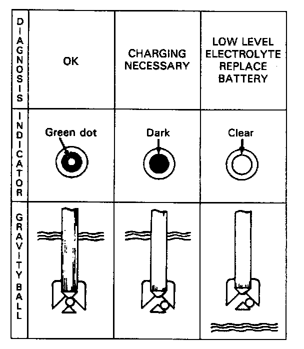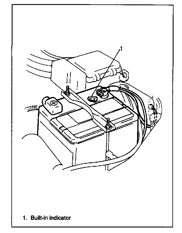 The battery has a built-in temperature compensated indicator in the top of the battery. This indicator is to be used with the following diagnostic procedure. When checking the indicator, make sure that the battery has a clean top. A light may be needed in some poorly-lit areas.