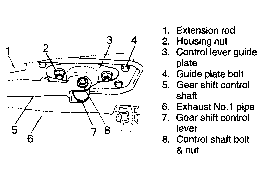 2. Remove 4 guide plate bolts and loosen extension rod nut at transmission end and then move extension rod aside.