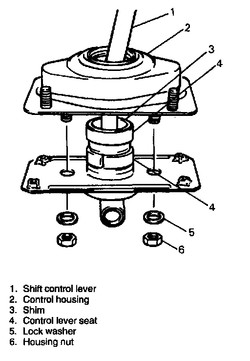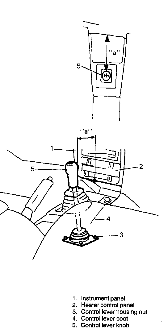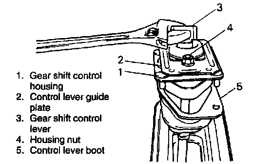 3. Install control lever assembly and related parts as they were. For positioning control lever, loosely install 4 guide plate bolts and 4 control lever housing nuts first, adjust position and then tighten those nuts and bolts. (Refer to Diagrams; Exploded Views) Diagrams