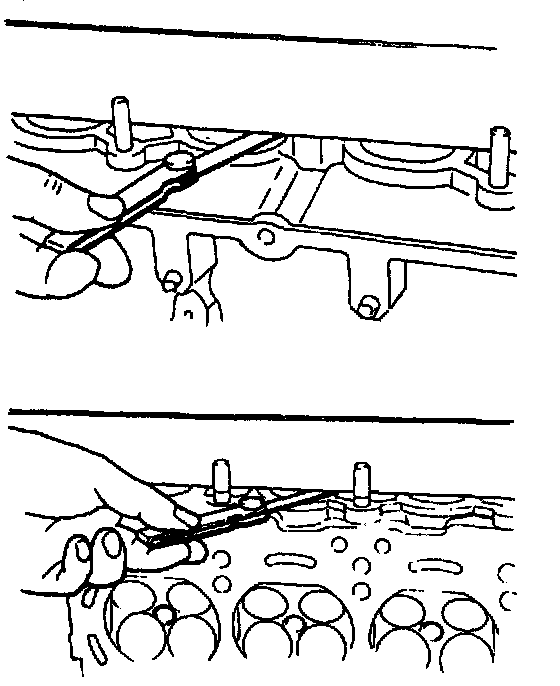 Check seating faces of cylinder head for manifolds, using a straightedge and thickness gauge, in order to determine whether these faces should be corrected or cylinder head replaced.