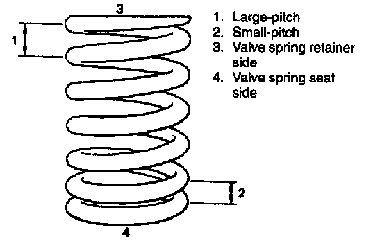 Each valve spring has top end (large-pitch end) and bottom end (small-pitch end). Be sure to position spring in place with its bottom end (small-pitch end) facing the bottom (valve spring seat side).