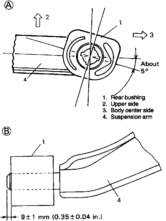 2. Install rear bushing to suspension arm as follows. First, push in rear bushing in such direction and angle as shown in figure (A) and drive it into such position as shown in figure (B).